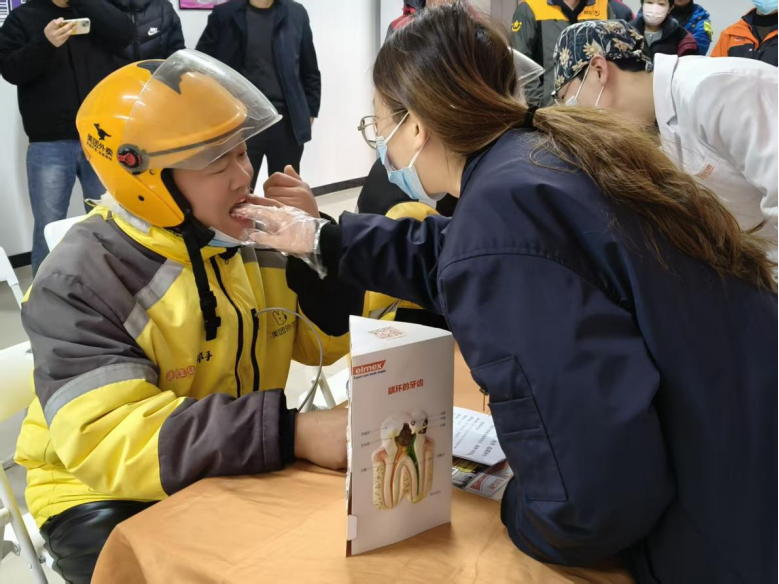 随后,嘉合口腔志愿服务团队,为每一位到场快递员、外卖员提供了细致的免费口腔检查与健康咨询,将关爱落实到“齿”。“平时忙得顾不上检查牙齿,这次活动真是想到我们心里去了。”顺丰快递员孟令常在检查后说道。及时的口腔健康服务,有助于他们在繁忙工作中保持良好状态,也为节日期间的奔波提供了一份实际的健康支持。