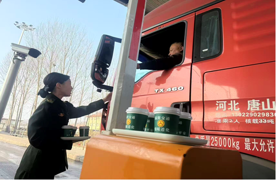 收费站工作人员为货车司机送“暖心咖啡”