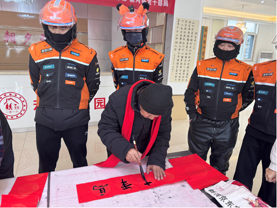 活动现场红纸铺展,墨香萦绕。本地书法爱好者与老党员志愿者挥毫泼墨,将吉祥寓意与温情祝福凝于一笔一画之间。外卖骑手们围站在书桌旁,或静静观赏书法创作,或挑选心仪的对联内容,或请志愿者定制专属新春联,现场热闹非凡。外卖配送员张师傅小心翼翼地收好春联,表示新的一年会继续坚守岗位,以更饱满的热情做好配送服务,用自己的“小奔波”守护城市的“大便利”。除春联与“福”字外,工作人员还为大家准备了精心设计的新春挂历,将实用与祝福融为一体。