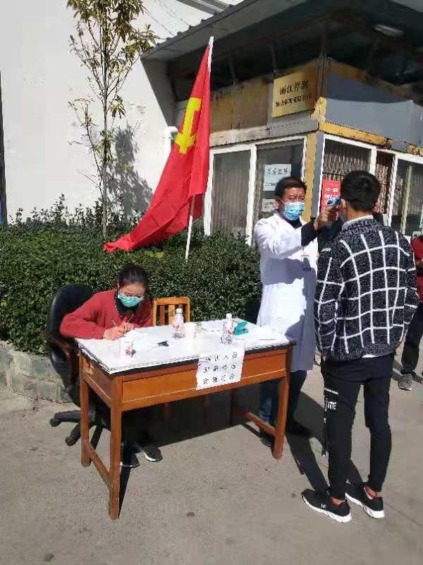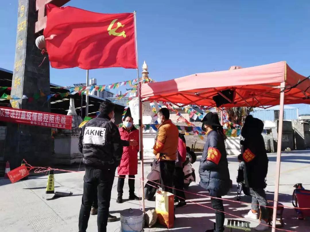 古城区束河街道黄山社区党员干部在安乐三组网格点设卡防控疫情。